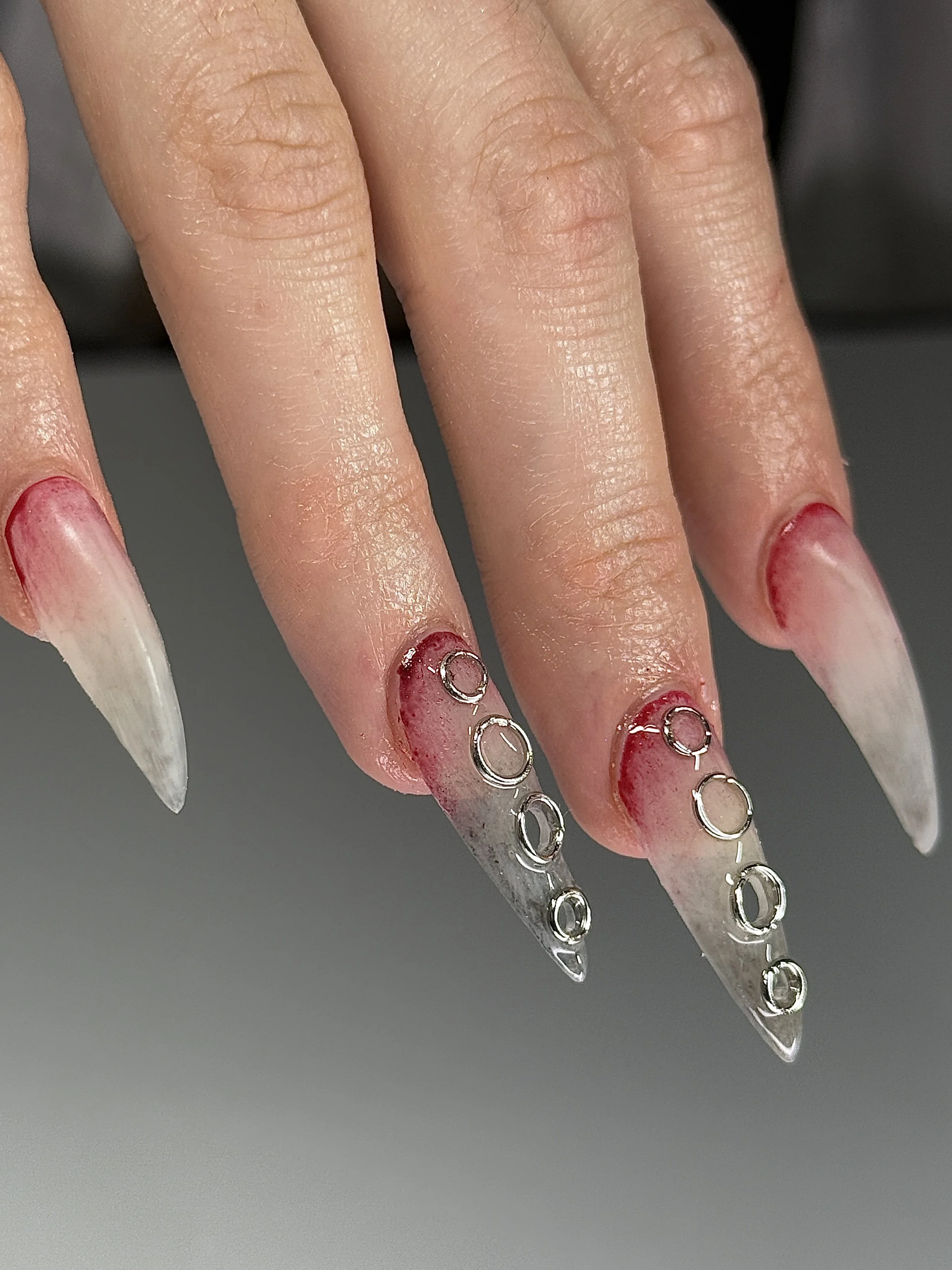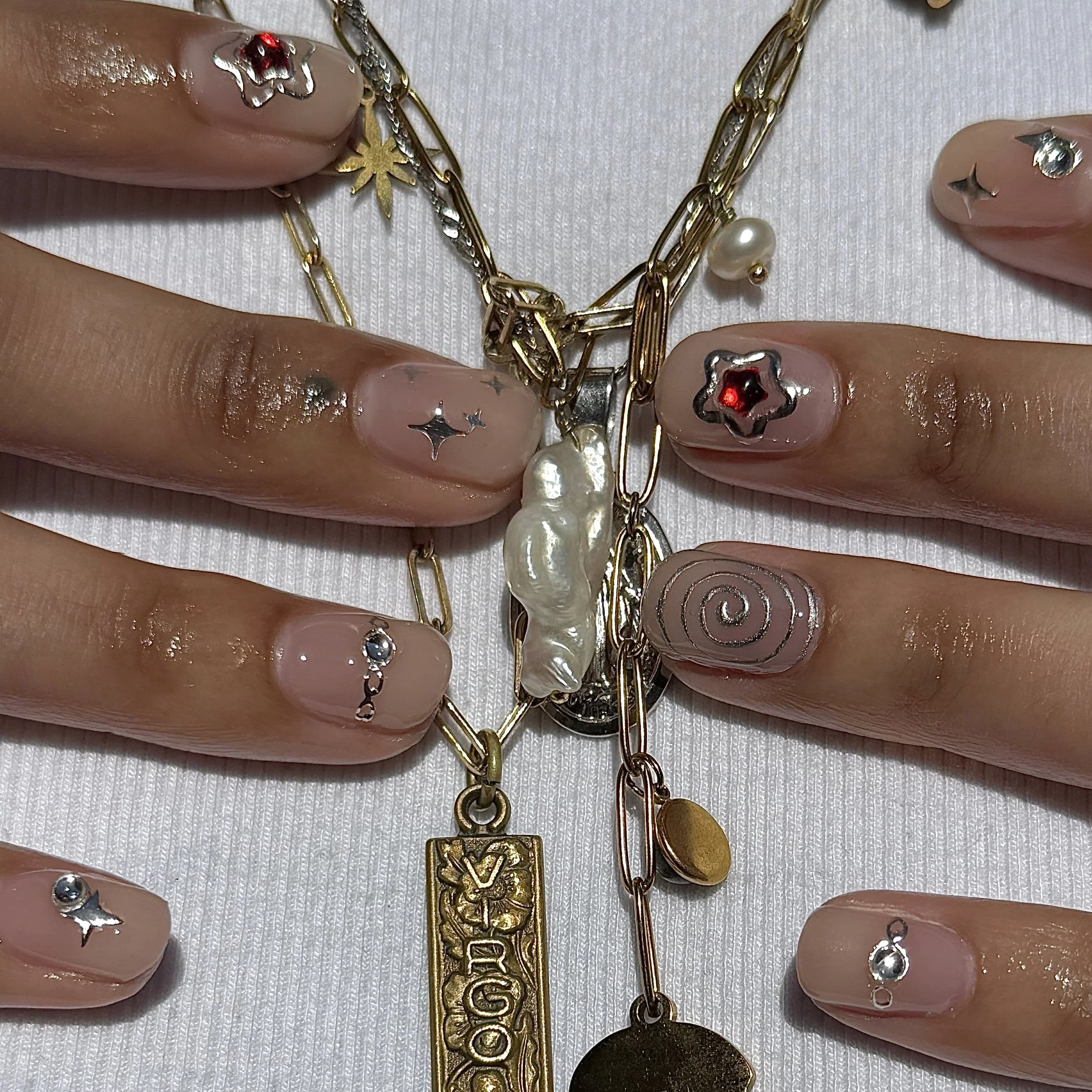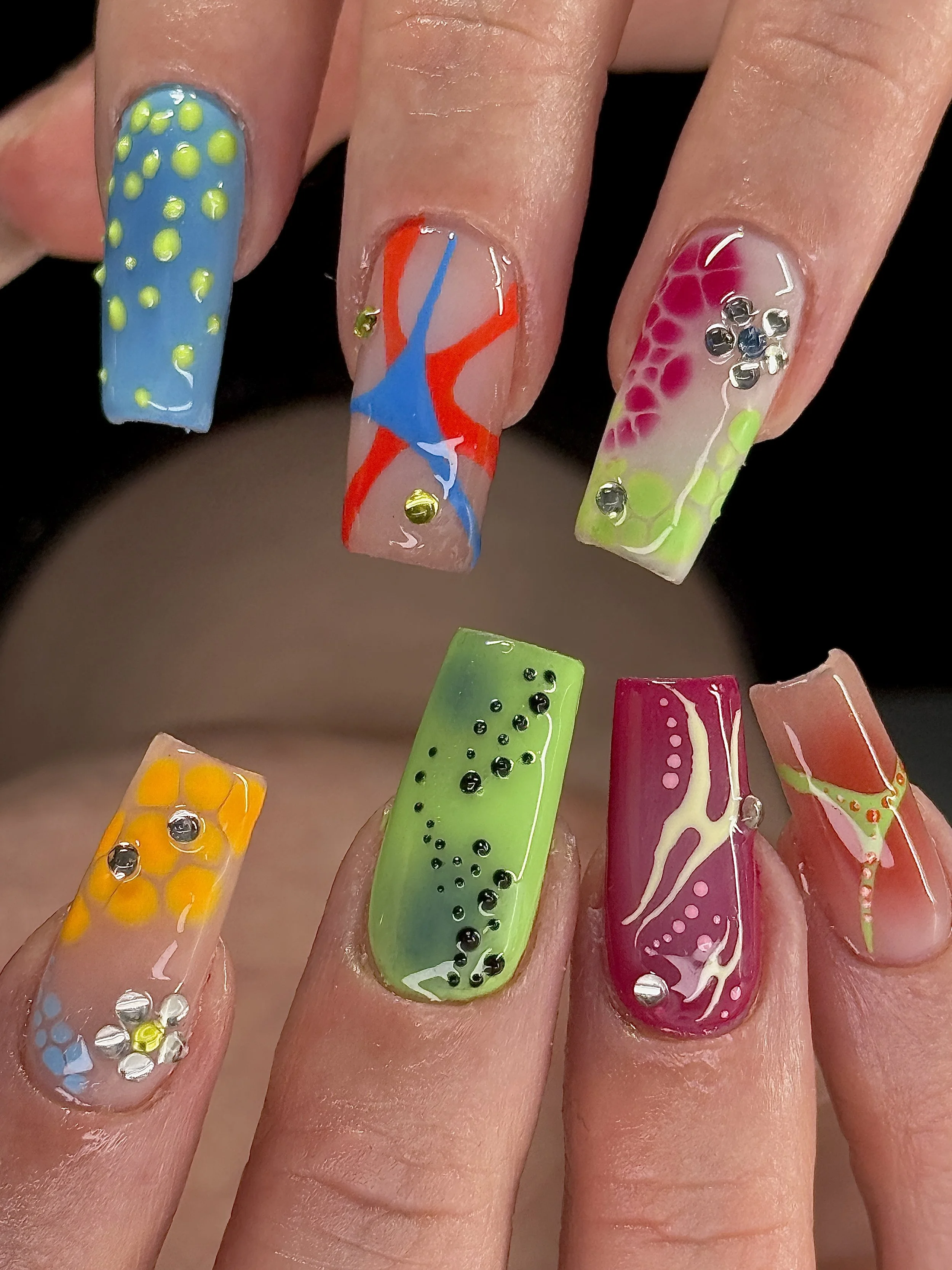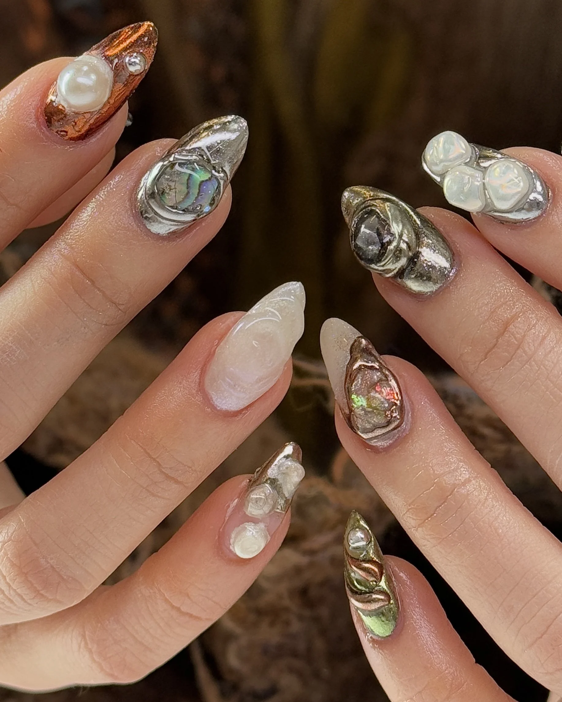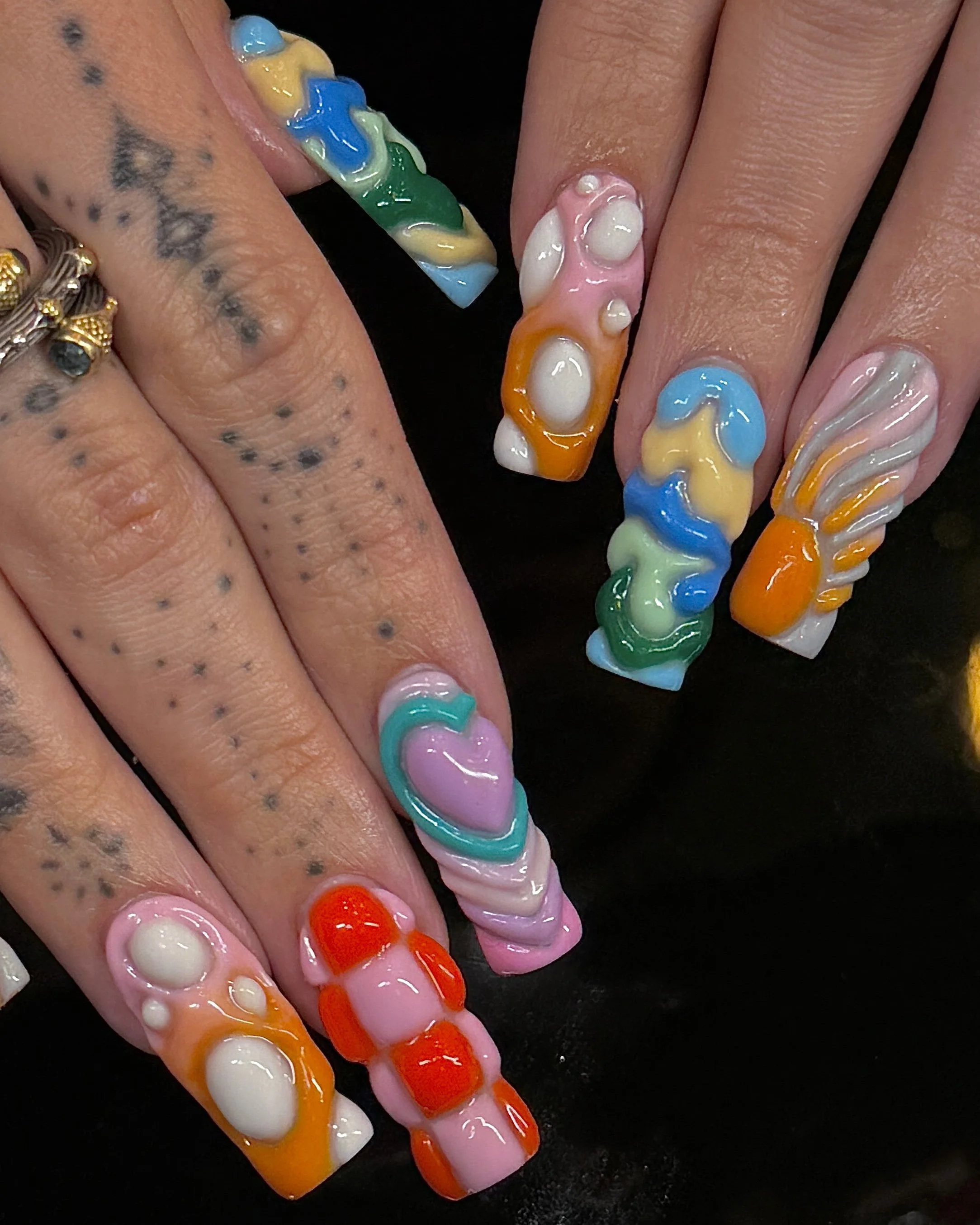 Medium stiletto gel extensions with a mix of silver, pink, and blue accents, including embedded rhinestones and 3D bubble designs. Done at 10 Piece Nails, New York City's top nail salon specializing in Aprés Gel-X and Structured Gel Manicures.