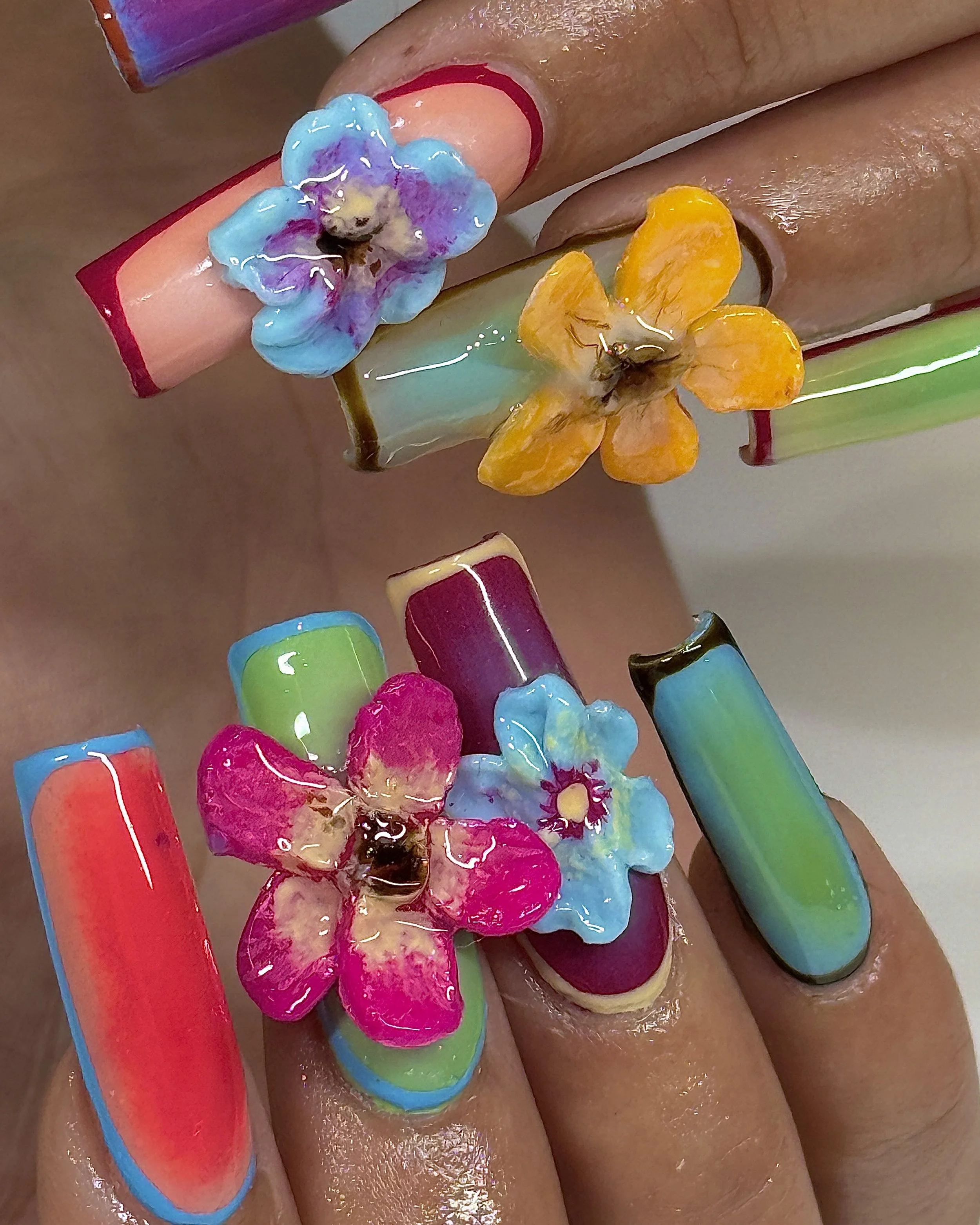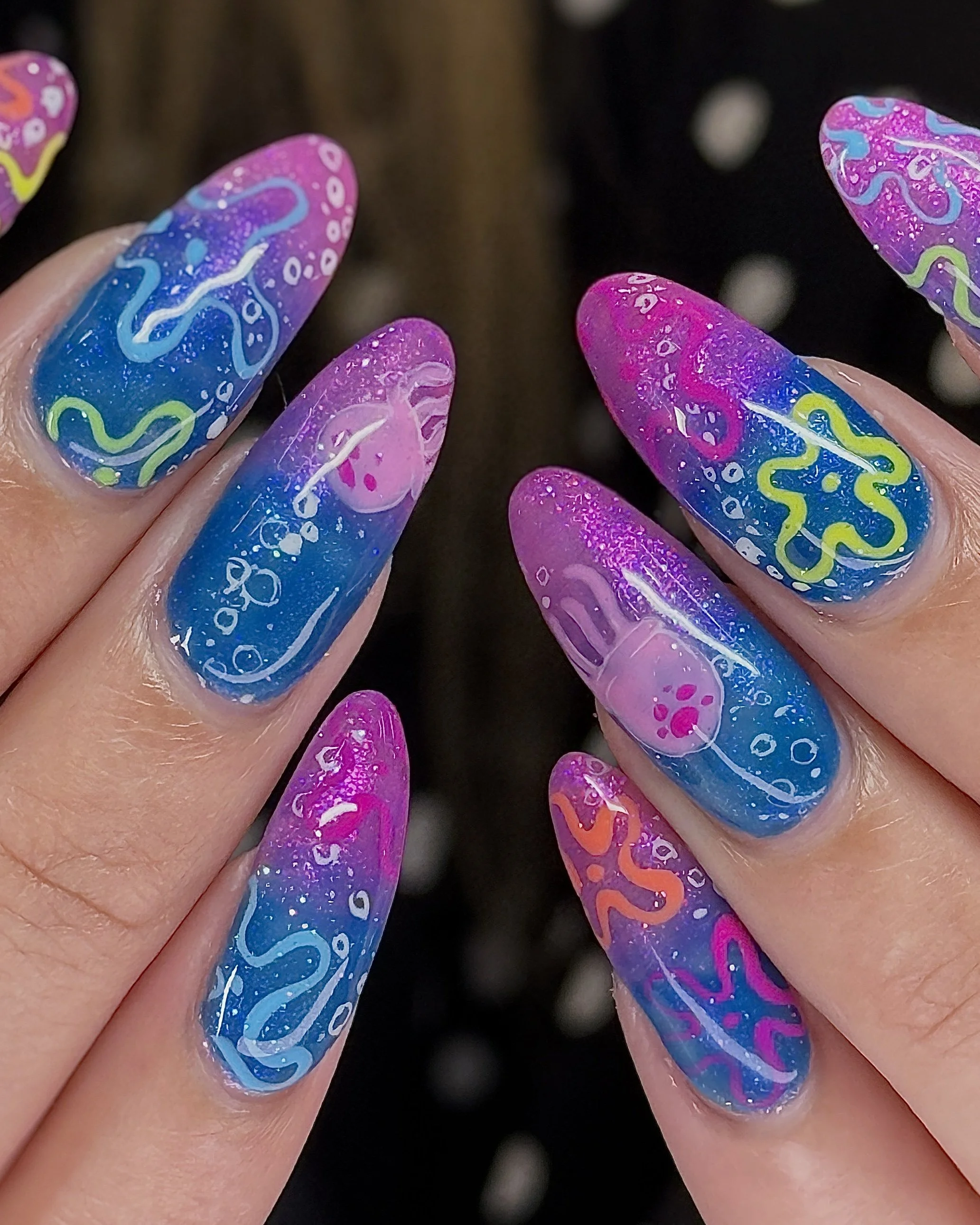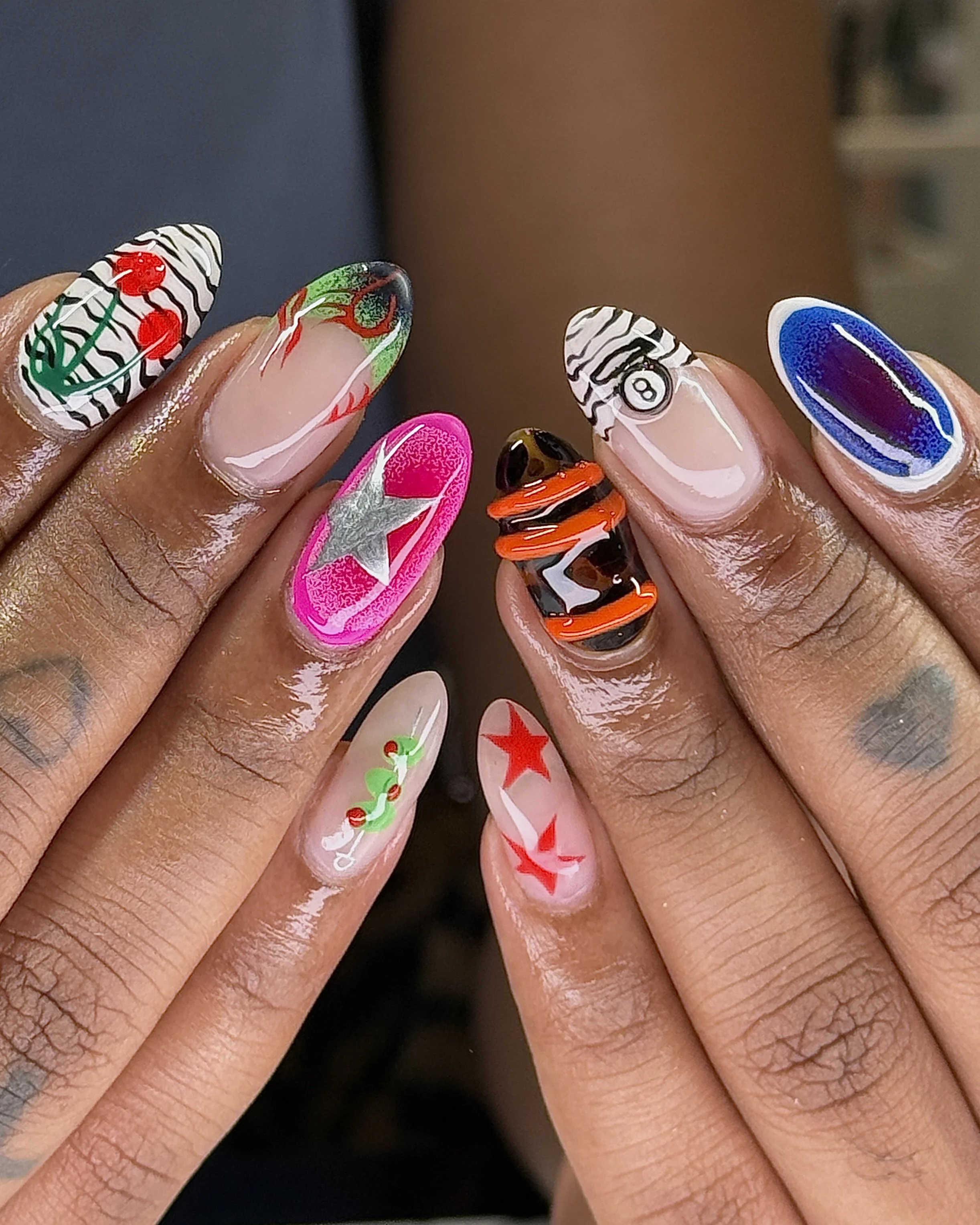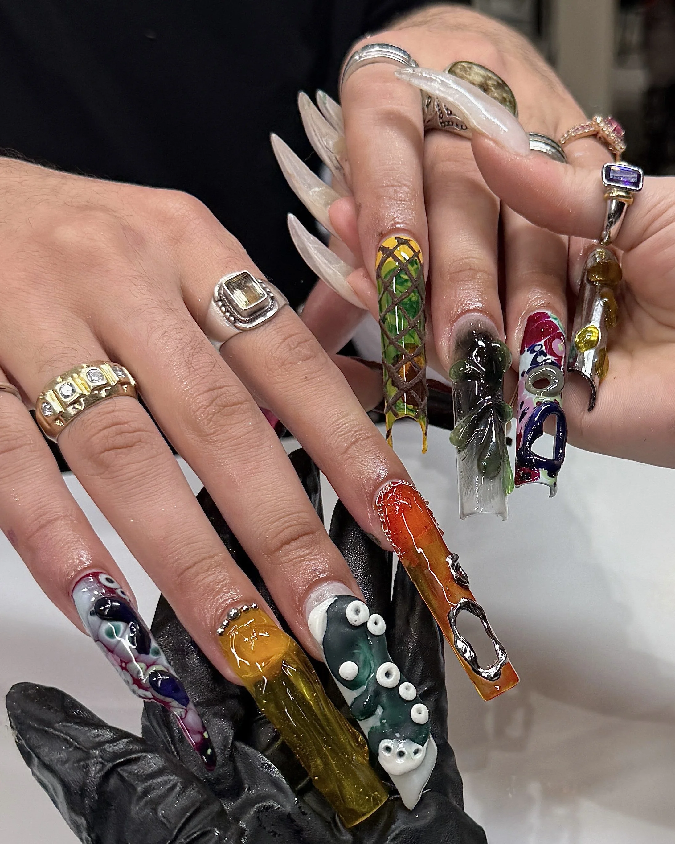 Medium stiletto gel extensions with a mix of silver, pink, and blue accents, including embedded rhinestones and 3D bubble designs. Done at 10 Piece Nails, New York City's top nail salon specializing in Aprés Gel-X and Structured Gel Manicures.