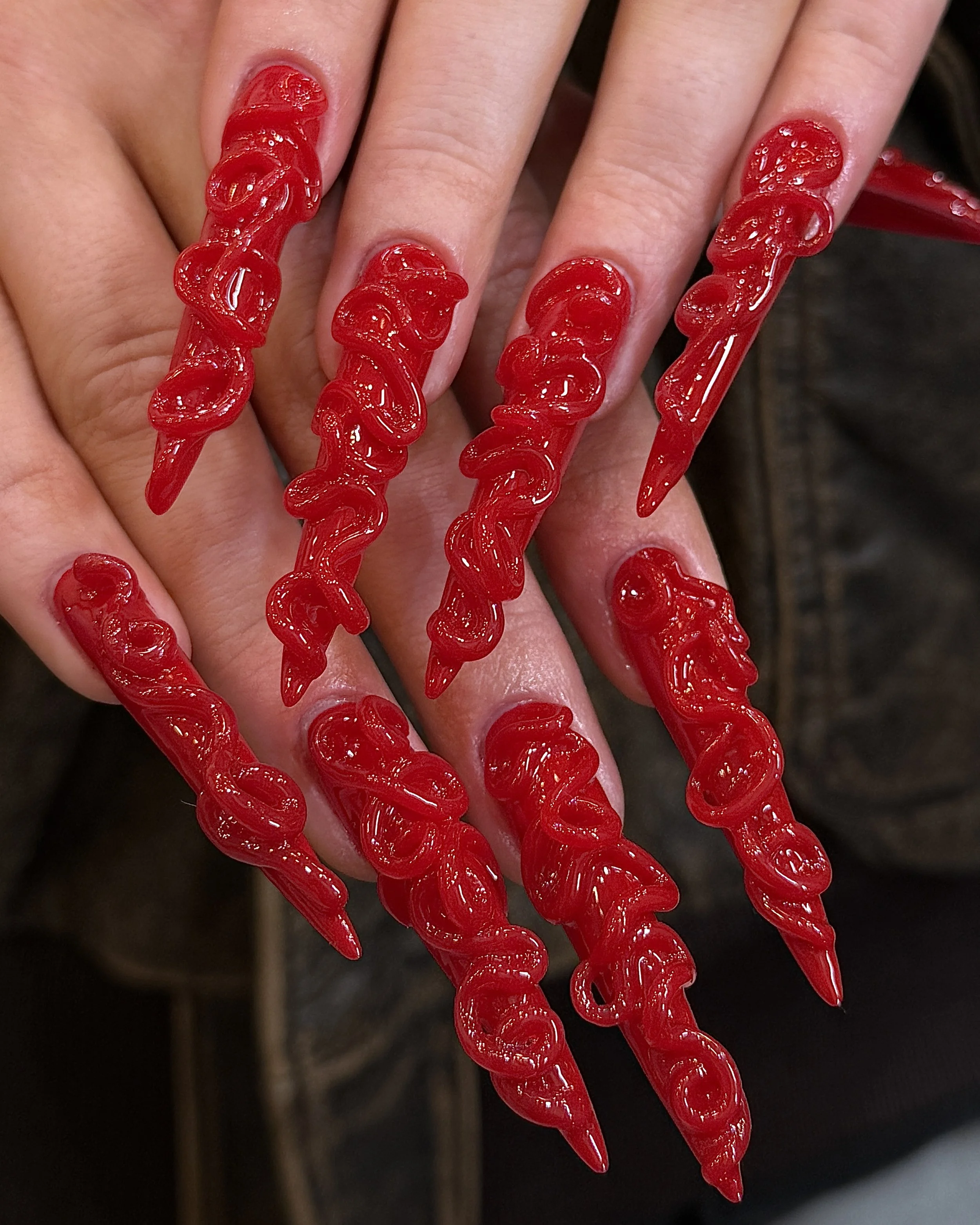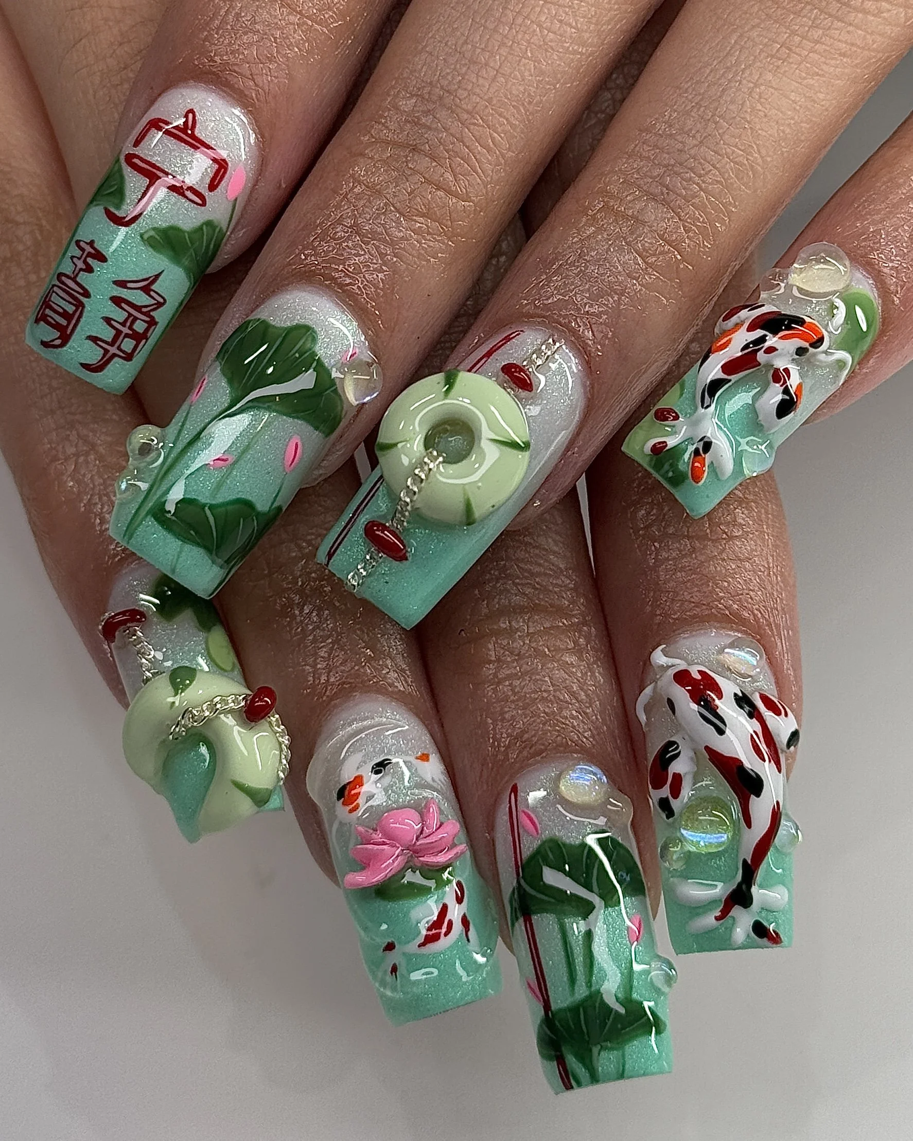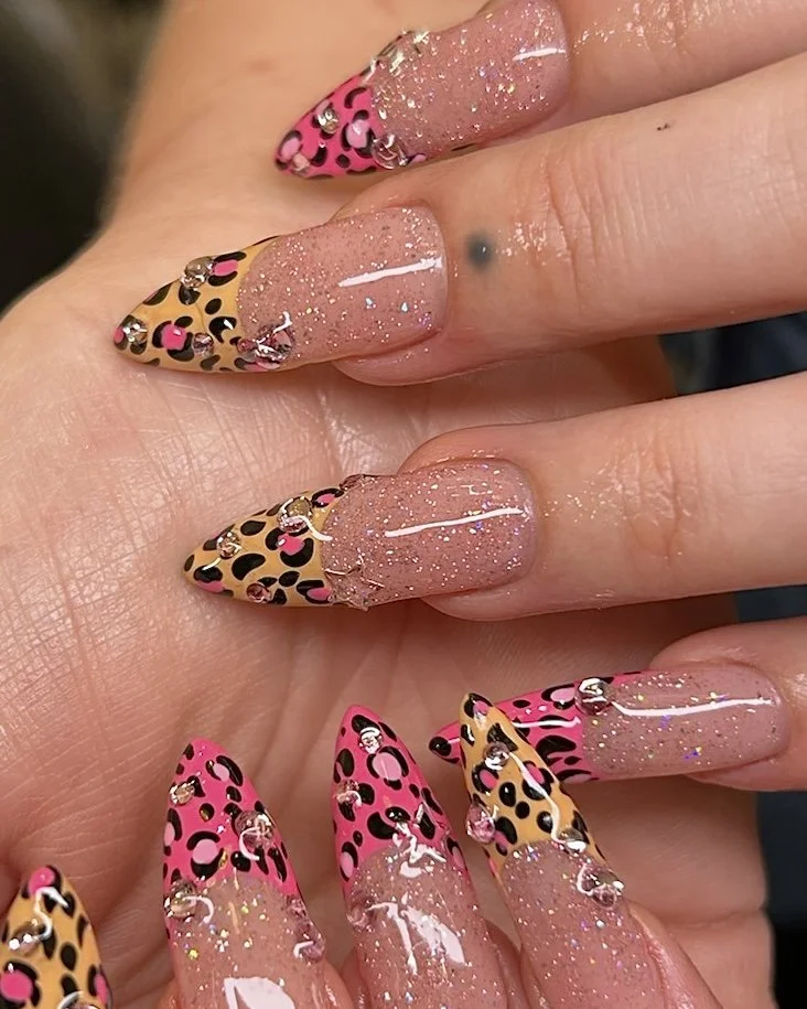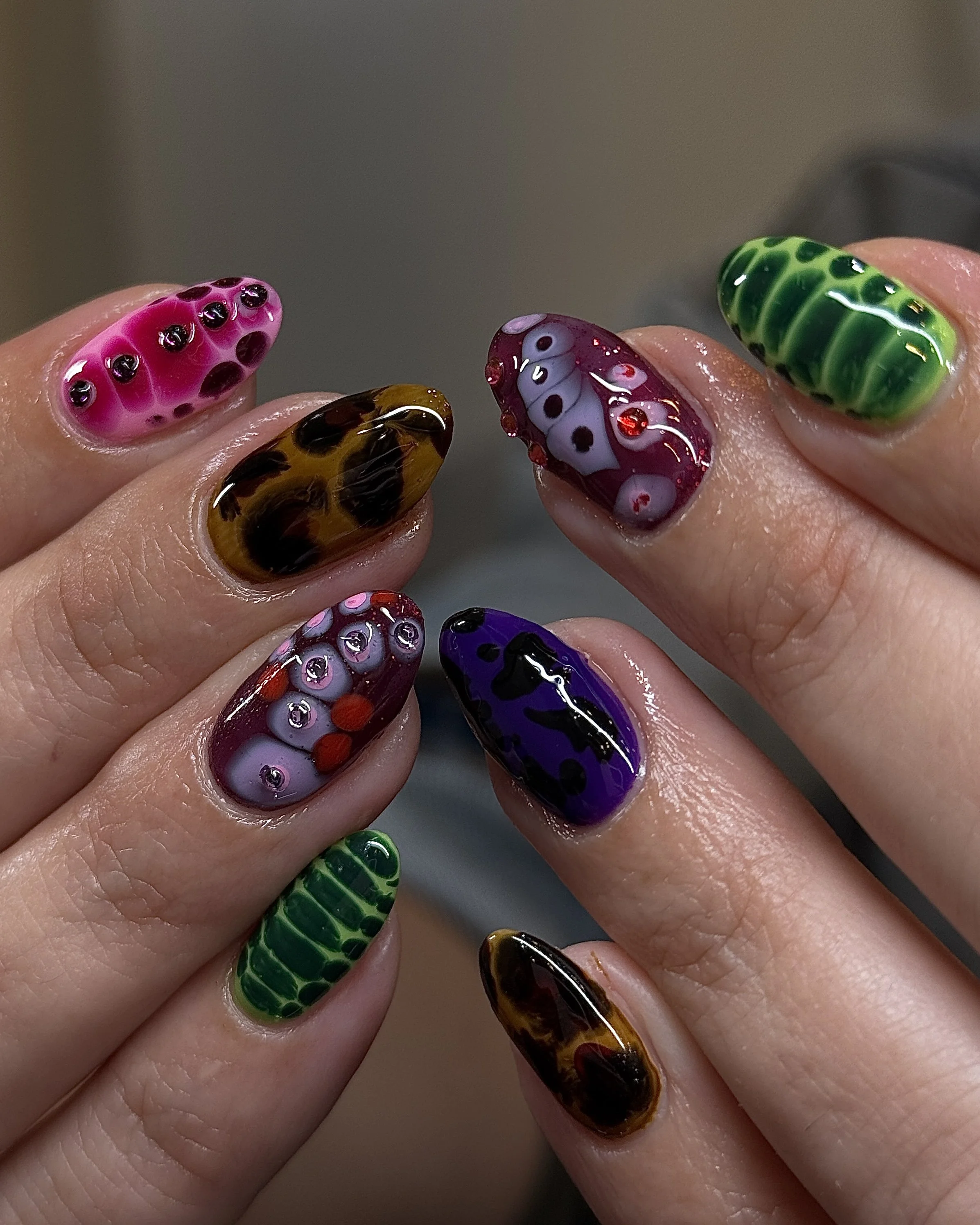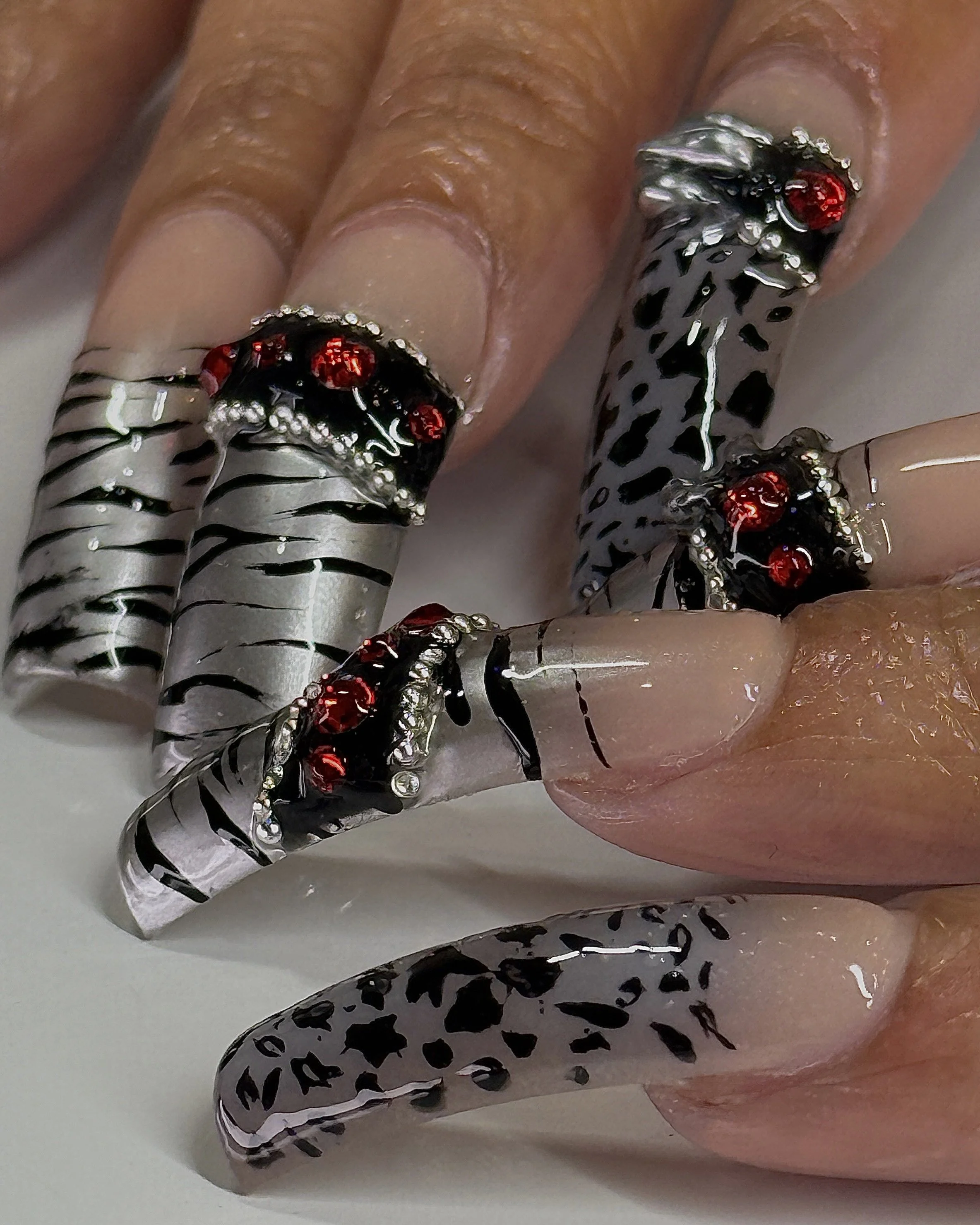 Medium stiletto gel extensions with a mix of silver, pink, and blue accents, including embedded rhinestones and 3D bubble designs. Done at 10 Piece Nails, New York City's top nail salon specializing in Aprés Gel-X and Structured Gel Manicures.