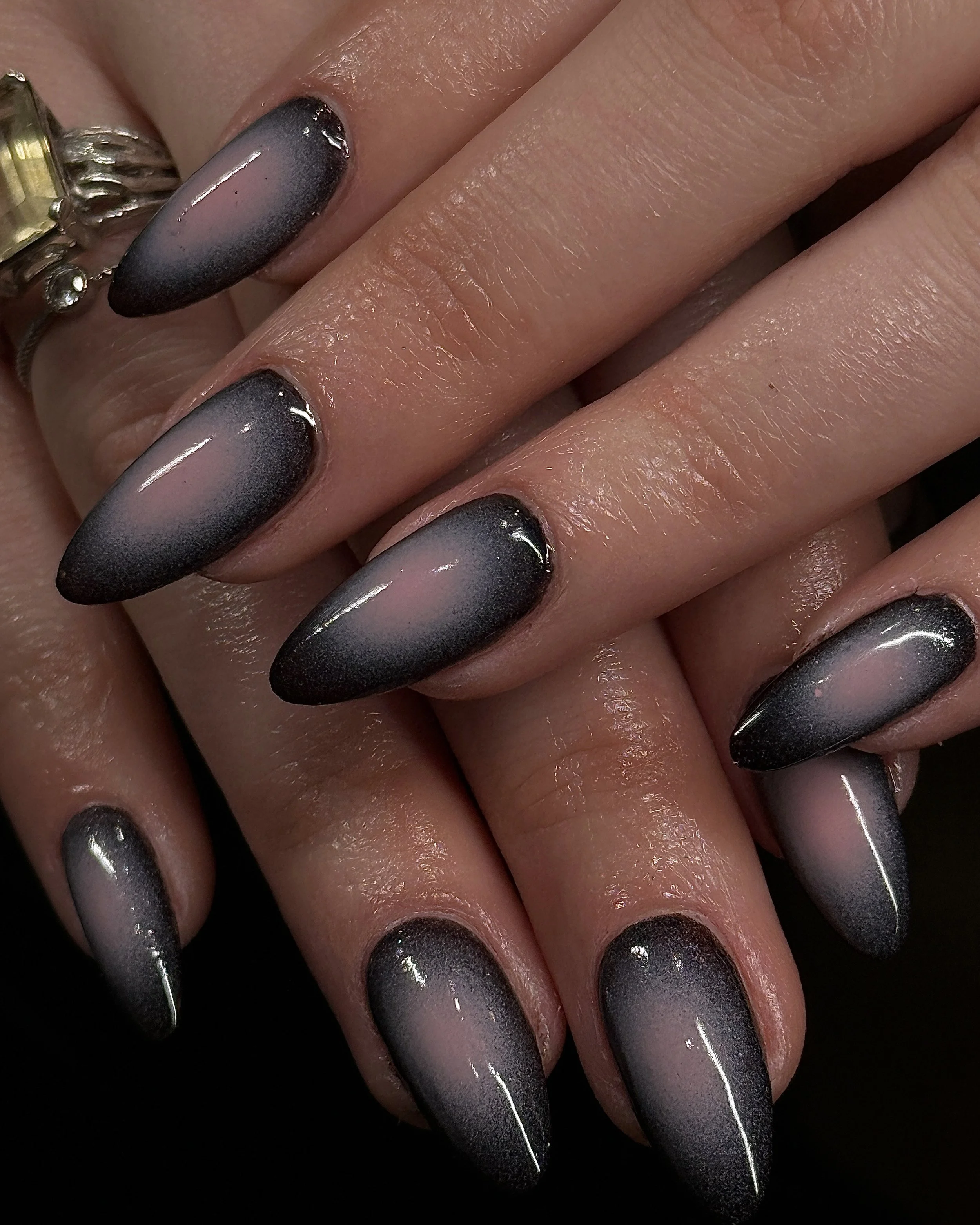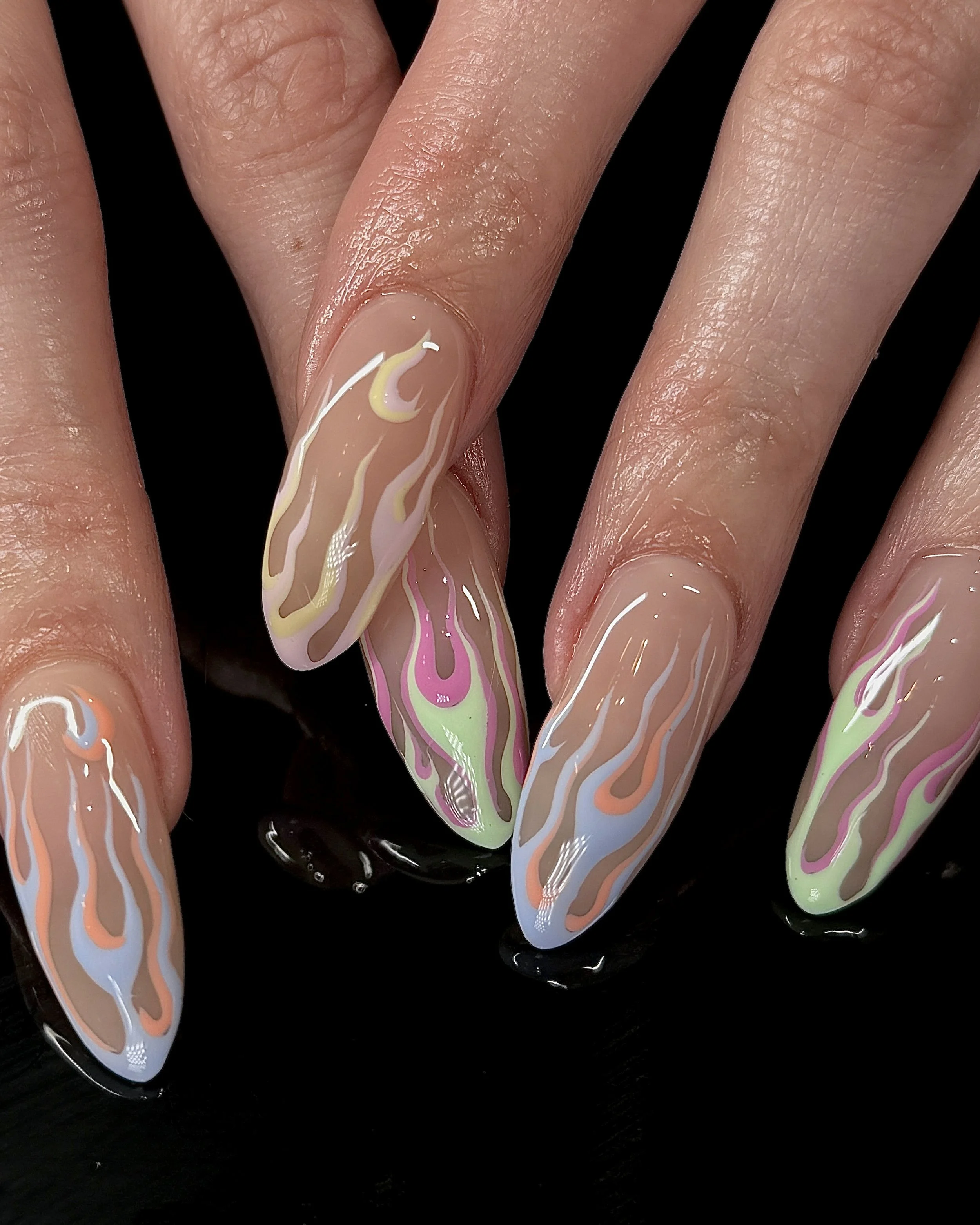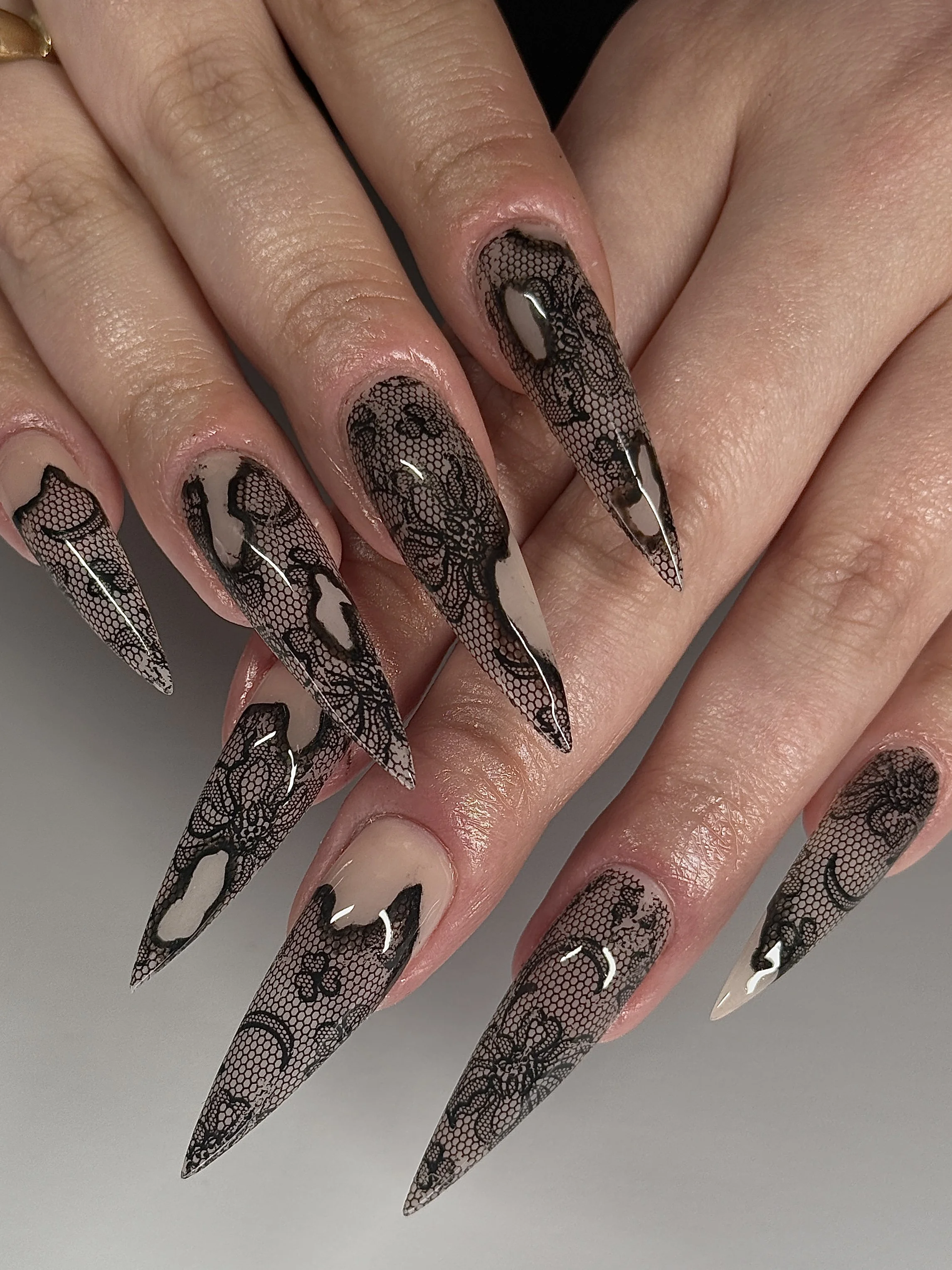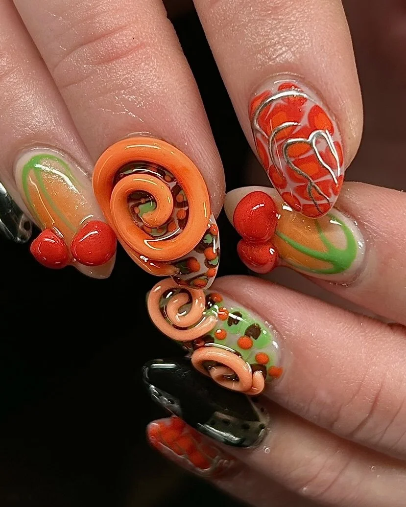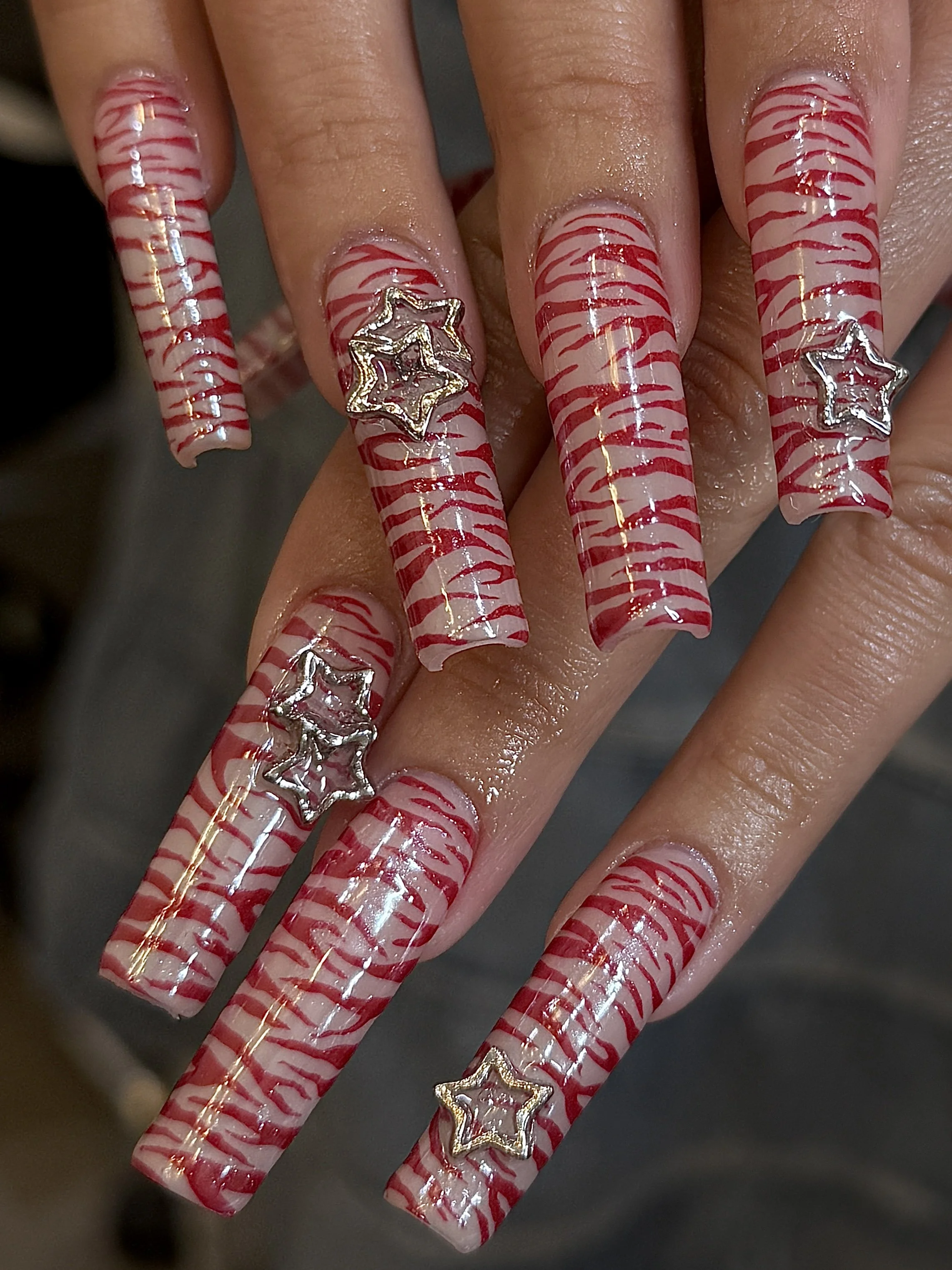 Medium stiletto gel extensions with a mix of silver, pink, and blue accents, including embedded rhinestones and 3D bubble designs. Done at 10 Piece Nails, New York City's top nail salon specializing in Aprés Gel-X and Structured Gel Manicures.